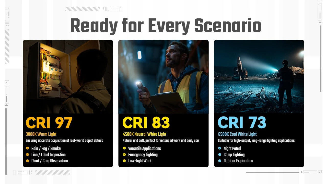 THREE LIGHTS IN ONE PACKAGE - Switch between 3000K warm light (CRI 97) for inspecting wiring and reading labels accurately, 4500K neutral white (CRI 83) for comfortable all-day warehouse work, or 6500K cool white (CRI 73) for maximum throw during outdoor patrols. Each color temperature serves specific tasks, eliminating the need to carry multiple lights.