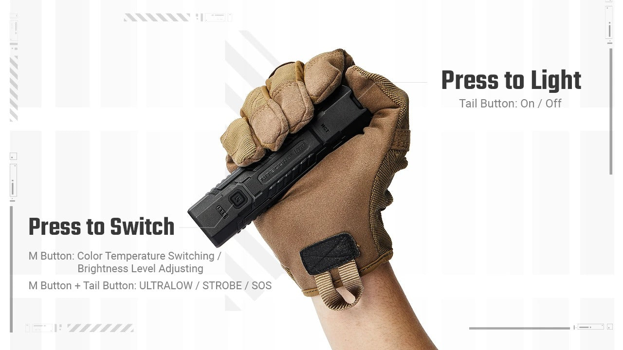 M Button - Short press cycles through brightness levels (LOW → MID → HIGH → TURBO). Press and hold to switch color temperatures.