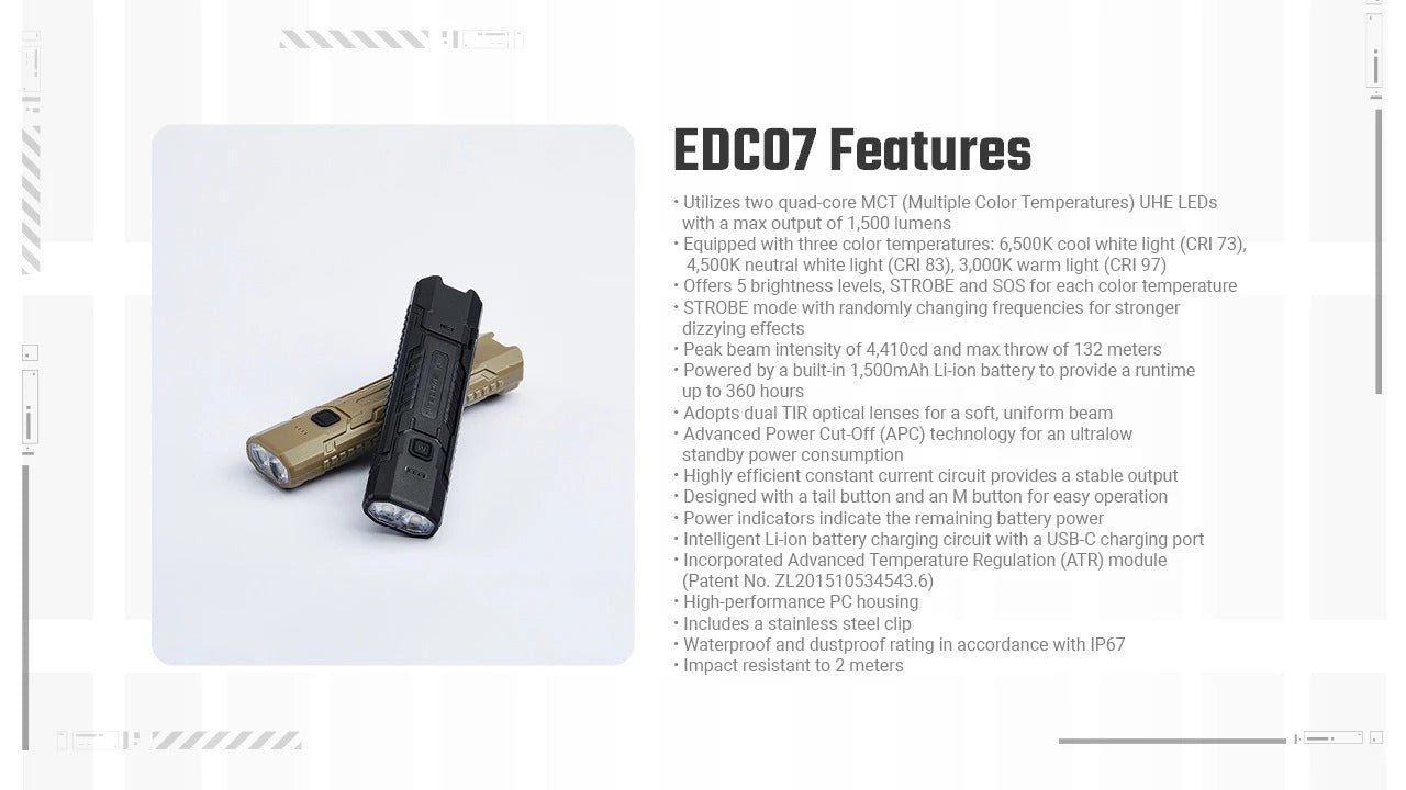 The EDC07 uses Nitecore's MCT (Variable CRI Multiple Color Temperatures) lighting system, which combines dual quad-core UHE LEDs with multi-faceted optical lenses. Each LED contains both a high-CRI core for accurate color rendering and a high-efficiency core for maximum output, effectively integrating different color temperatures and CRI levels into a single, fully blended beam.