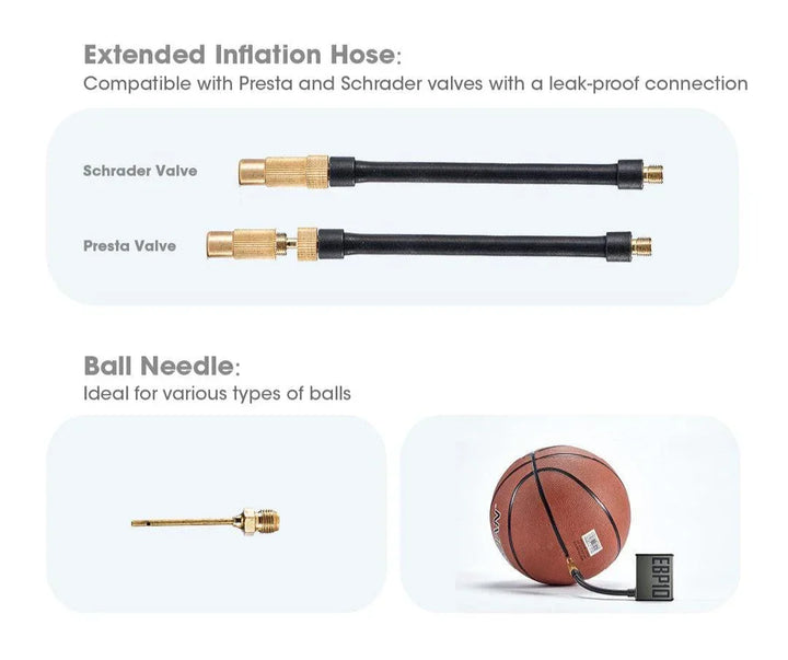 - Compatible with Presta and Schrader Valves: Easily inflate a wide range of tires and sports gear.