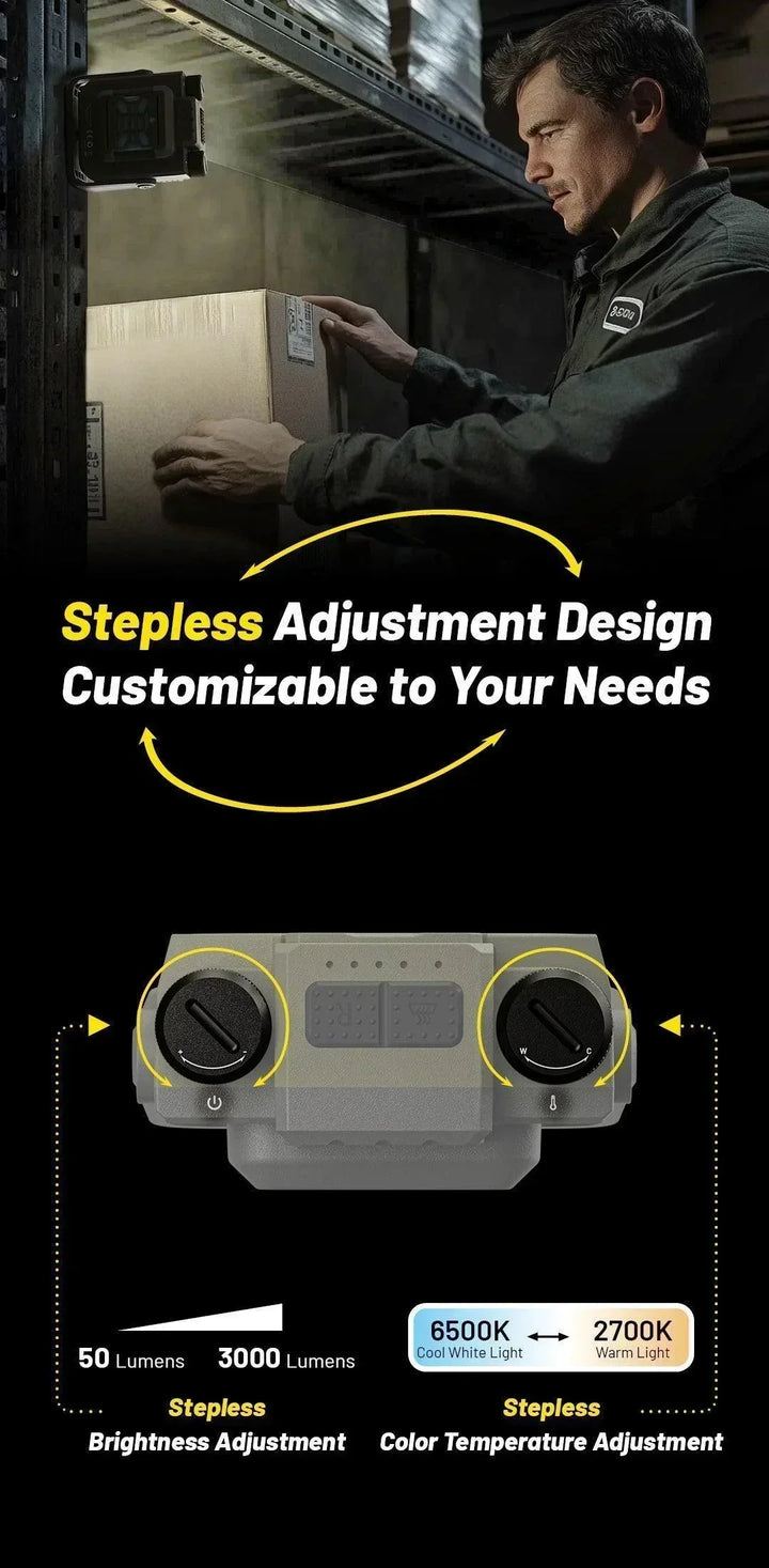 With stepless brightness adjustment from 50-3000 lumens and color temperature control from warm 2700K to cool 6500K, you can customize the perfect lighting for any task—from detailed close work to wide area illumination.