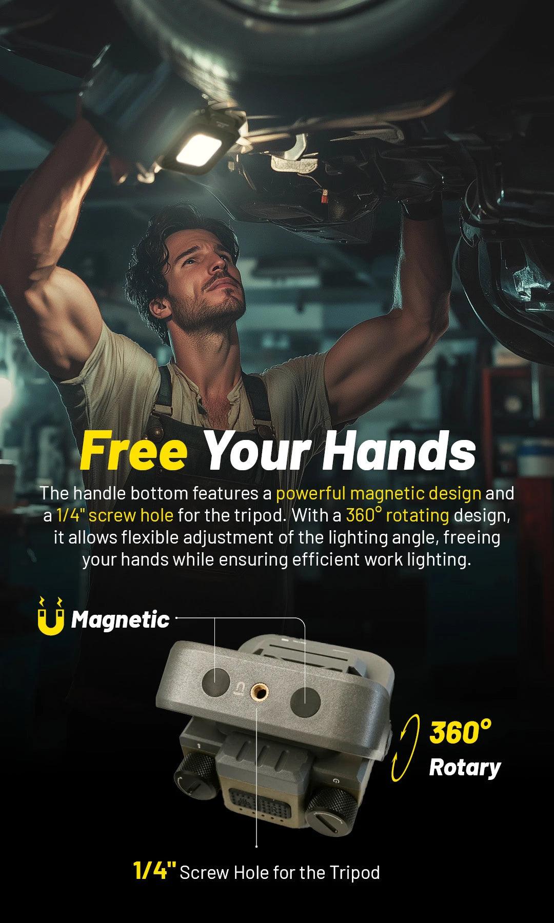POSITION YOUR LIGHT EXACTLY WHERE NEEDED - The 360° rotating handle with powerful magnetic base (22N/3.4kg pull force) and tripod mount lets you place the light precisely where you need it, freeing your hands to focus on the task at hand.