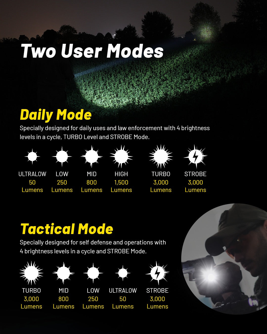| MODE | LUMENS | RUNTIME | DISTANCE |