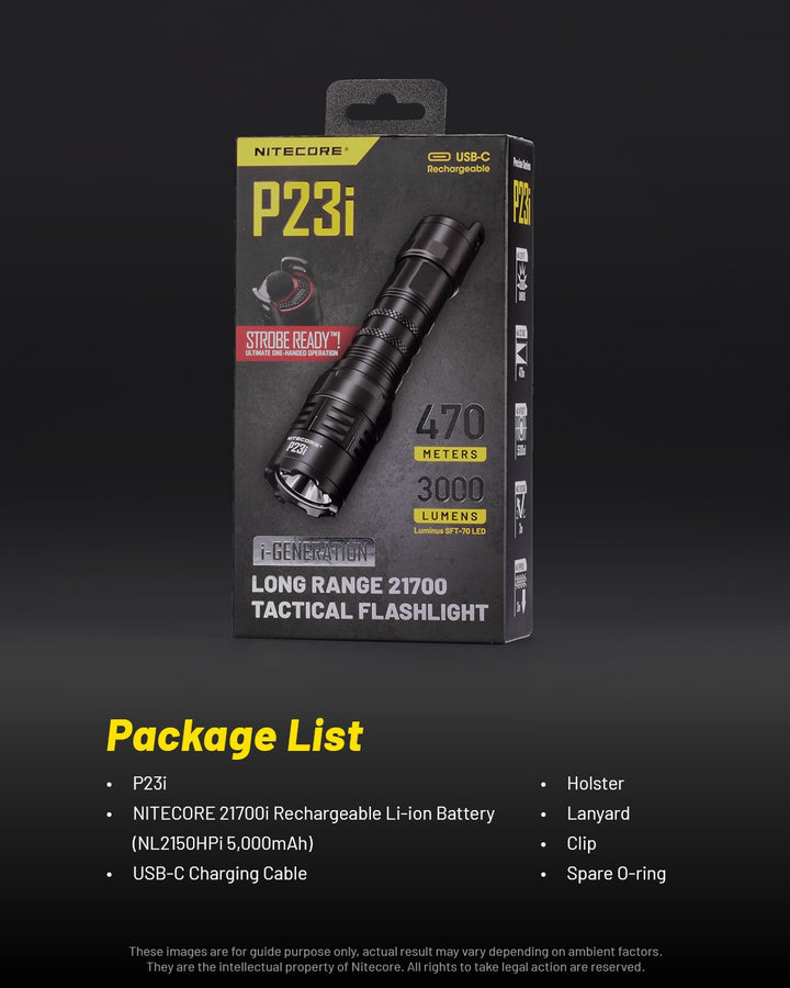 | Battery Requirements | Only compatible with NITECORE 21700 i-Series batteries with an output over 15A. NOT compatible with conventional 21700 / 18650 batteries and CR123 / RCR123 batteries. If you need more than the 1 included battery, click here. |
