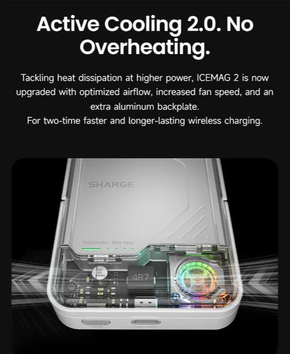 Active Cooling 2.0. No Overheating. - Tackling heat dissipation at higher power, the Active Cooling 2.0 system is now upgraded with optimized airflow, increased fan speed, and an extra aluminum backplate for 2x faster and longer-lasting wireless charging.