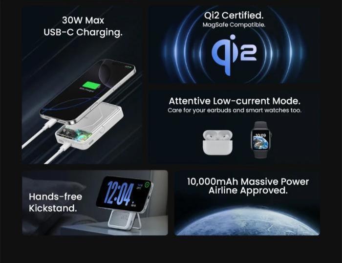 | Output | USB-C: 5V⎓3A, 9V⎓3A, 12V⎓2.5A, 15V⎓2A, 20V⎓1.5A (30W Max) Wireless: 5W, 7.5W, 15W |