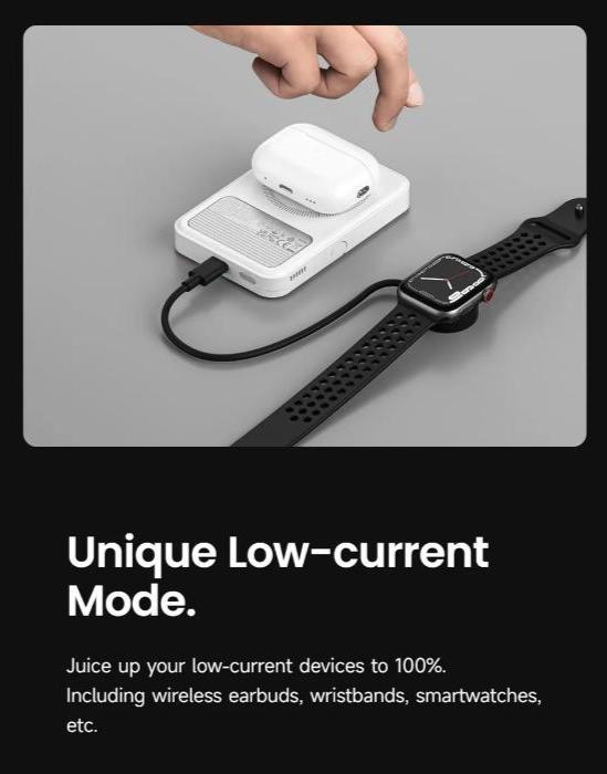 Unique Low-current Mode. - Not just for smartphones, our power bank supports low-current devices like wireless earbuds, wristbands, and smartwatches. Juice up everything you own with ease.