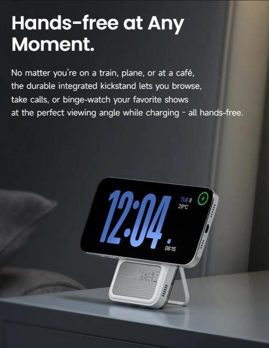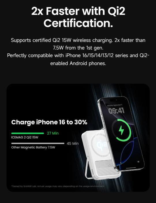 2x Faster with Qi2 Certification - Supports certified Qi2 15W wireless charging. 2x faster than 7.5W from the 1st gen. Perfectly compatible with iPhone 16/15/14/13/12 series and Qi2-enabled Android phones. Charge iPhone 16 Pro Max to 50% in just 25 minutes. Fully recharges itself in 1.5 hours.