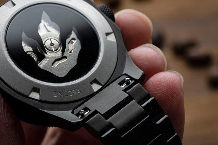 Depicted on the caseback is artwork of a T-Rex footprint, which matches the TINI2's laser-engraved claw marks.