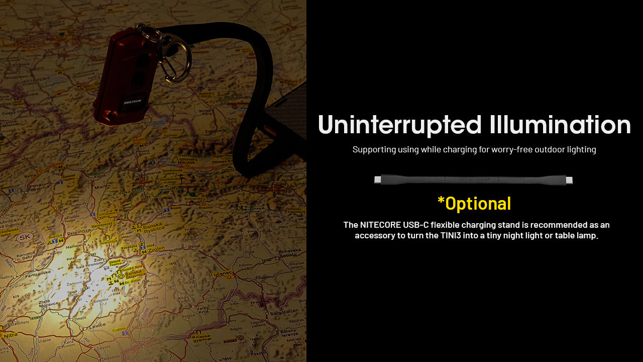 INSTANT TABLE LAMP — Connect your Nitecore keychain light to a USB-C power source and bend the cable to aim the light at a book, map, or workspace. The cable holds its position, giving you a hands-free light for reading, working, or navigating.