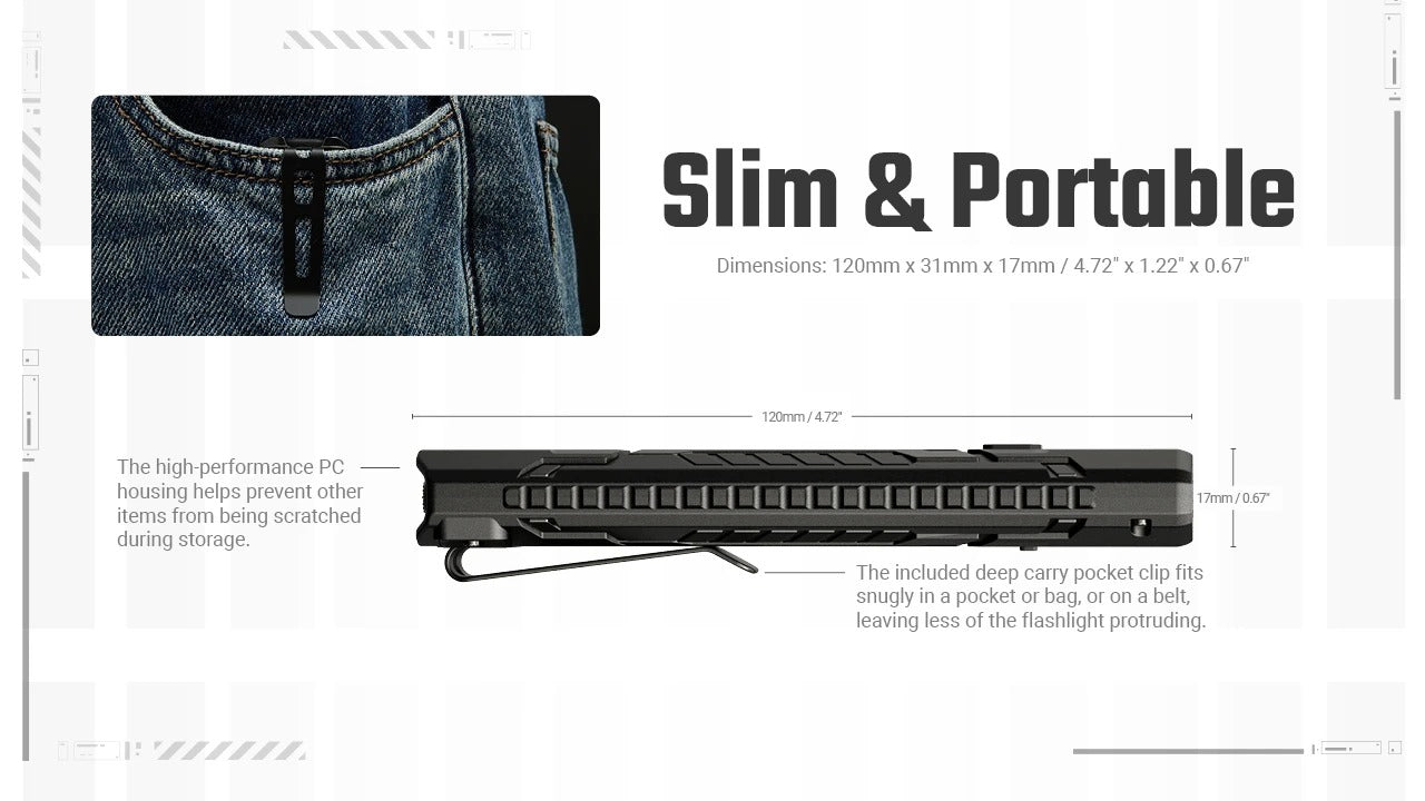 COMFORTABLE ALL-DAY CARRY - At just 70 grams with battery, this light delivers full-size output in a body that weighs less than most smartphones. The high-performance polycarbonate housing cuts weight dramatically compared to aluminum lights while maintaining complete IP67 waterproof protection. Clip it to your pocket in the morning and forget it's there until you need it.
