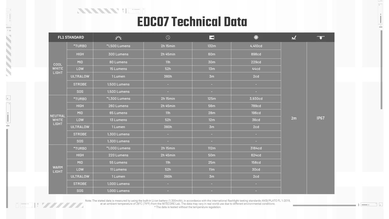 The EDC07 uses Nitecore's MCT (Variable CRI Multiple Color Temperatures) lighting system, which combines dual quad-core UHE LEDs with multi-faceted optical lenses. Each LED contains both a high-CRI core for accurate color rendering and a high-efficiency core for maximum output, effectively integrating different color temperatures and CRI levels into a single, fully blended beam.