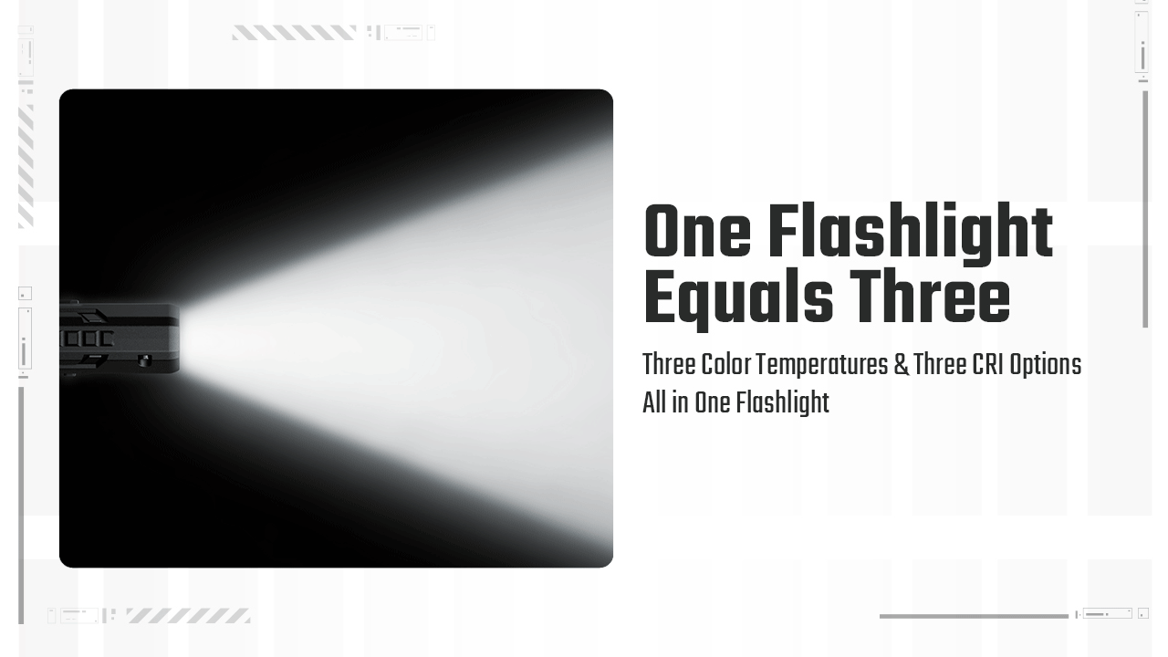 THREE LIGHTS IN ONE PACKAGE - Switch between 3000K warm light (CRI 97) for inspecting wiring and reading labels accurately, 4500K neutral white (CRI 83) for comfortable all-day warehouse work, or 6500K cool white (CRI 73) for maximum throw during outdoor patrols. Each color temperature serves specific tasks, eliminating the need to carry multiple lights.