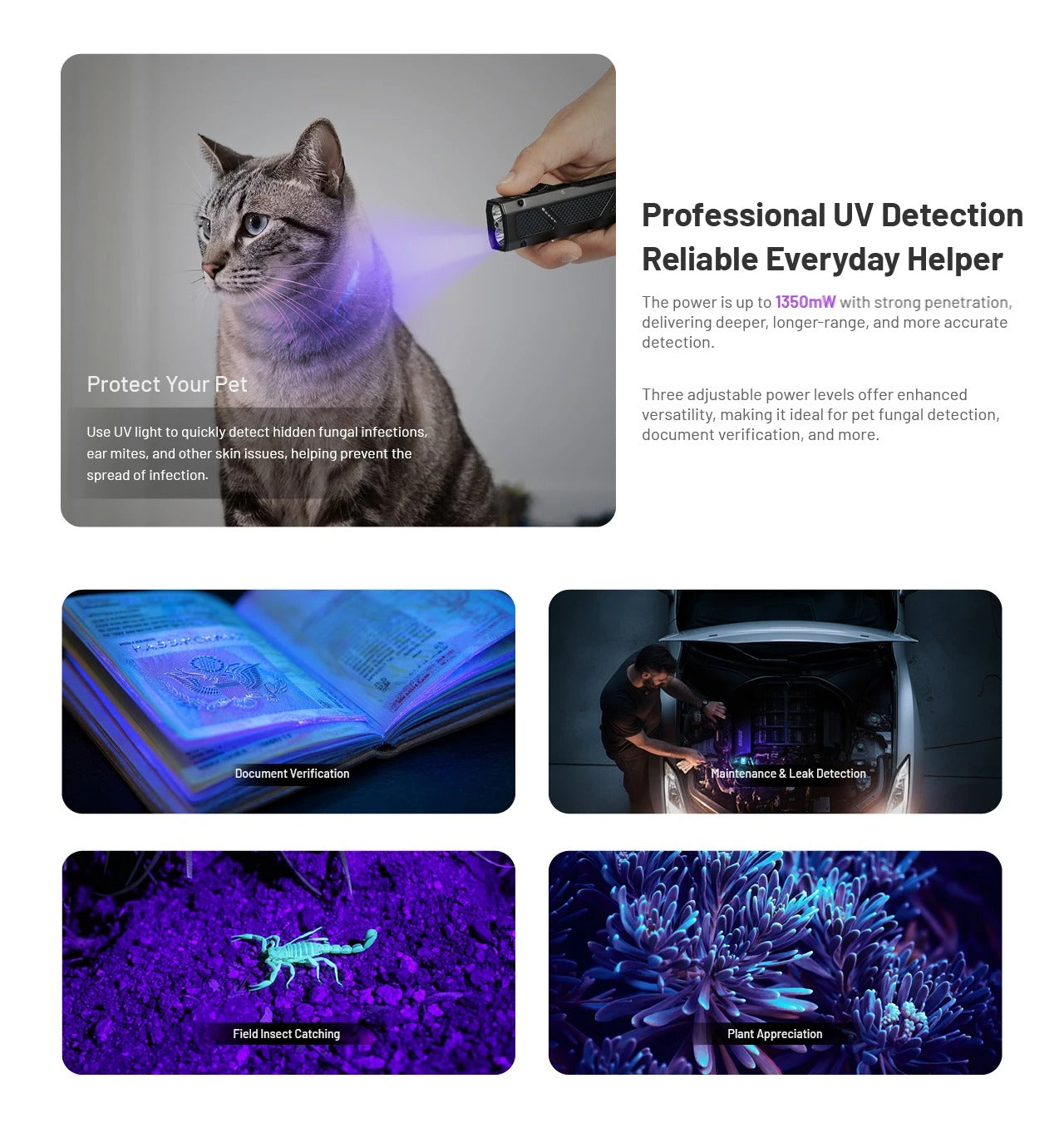 PROFESSIONAL-GRADE UV AUTHENTICATION - At 1,350mW peak output, this reveals security features on currency, IDs, passports, and credit cards clearly even in ambient light. Three power levels let you match intensity to the task: 220mW for basic checks with 13 hours runtime, 650mW for standard authentication with 5 hours runtime, or 1,350mW for maximum output when you need it with 2 hours runtime.