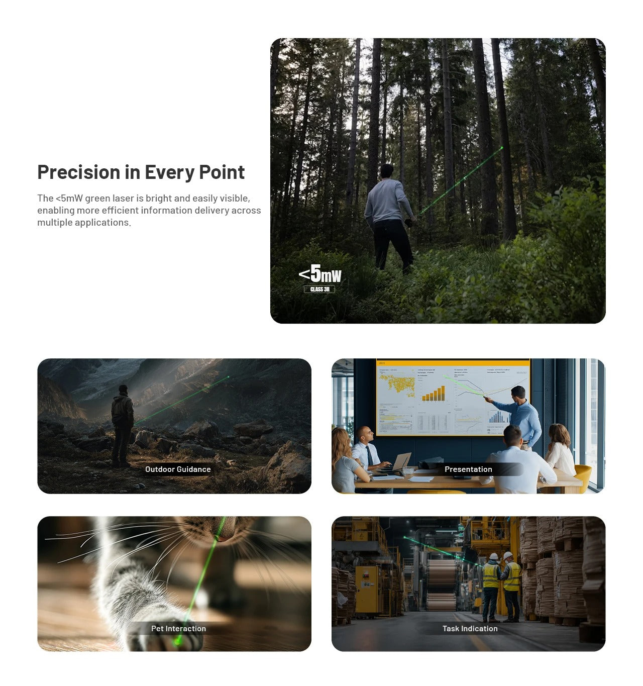 - Class 3R green laser (<5mW) for precise pointing and presentations