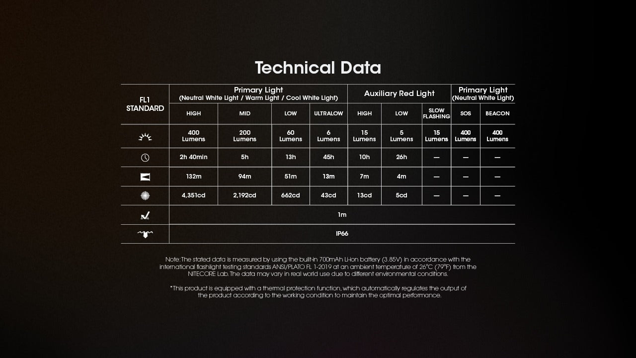 ANSI/PLATO FL 1 2016 Standard is a set of flashlight performance guidelines that confirms the light you're buying has been tested to spec, and you're not buying into false performance claims.TECHNICAL SPECS